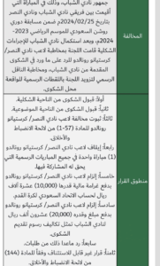 تم صدور العقوبة الرسمية على كريستيانو رونالدو، قائد فريق النصر، من قبل لجنة الانضباط والأخلاق في الاتحاد السعودي لكرة القدم. تم إيقاف رونالدو لمباراة واحدة بسبب تصرفه تجاه جماهير نادي الشباب.